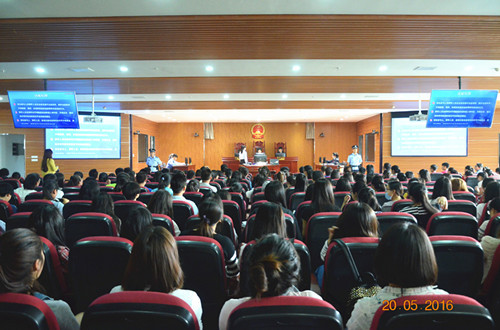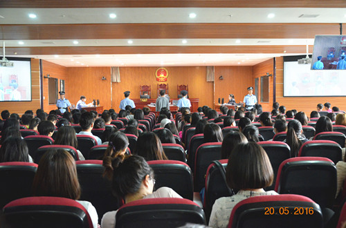 【宁夏大学新闻中心讯 政法学院 魏均一】5月20日,我校政法学院与银川市兴庆区人民法院联合开展的“庭审进校园”活动在贺兰山校区文科楼模拟法庭举行。银川市兴庆区人民法院和检察院工作人员、学校保卫处工作人员代表、政法学院法学专业师生共计400余人旁听了庭审全过程。