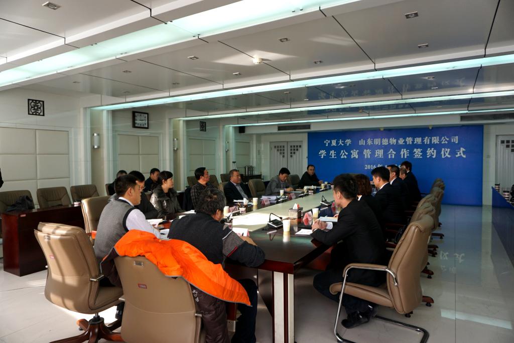 【宁夏大学新闻中心讯 张景/文、图】12月9日下午,我校与山东明德物业管理有限公司关于怀远校区学生公寓楼物业管理合作签字仪式,在贺兰山校区主楼11楼会议室举行。