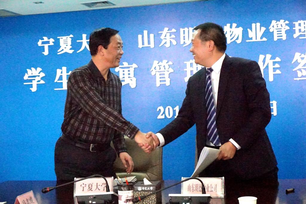 后勤集团总经理祁泽平与山东明德物业管理有限公司副总裁王正坤共同签订《宁夏大学怀远校区学生公寓物业外包管理合同》。