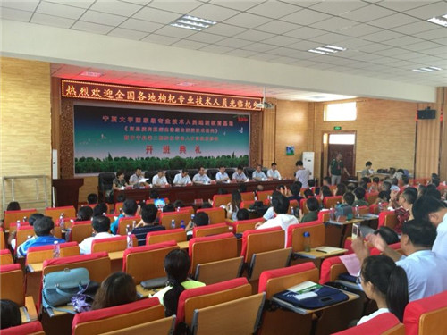 【宁夏大学新闻中心讯 继续教育学院 王江辉】7月14日,我校国家级专业技术人员继续教育基地《高品质枸杞病虫害综合防控技术研究》暨中宁县第二期枸杞专业人才高级研修班在中宁县职业教育中心开班。自治区人社厅副厅长马力、我校副校长马宗保及中宁县委领导张建兵、常丁梁、张银强、徐辉出席开班典礼。来自新疆、青海、内蒙古、河北等9个省区的70余名枸杞专业技术人员参加培训。