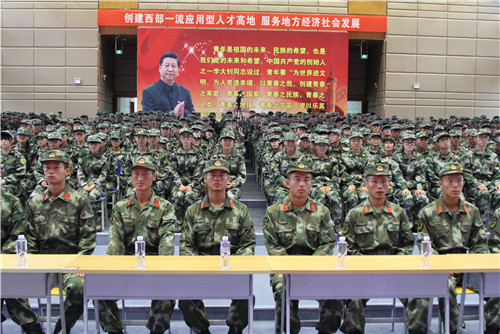 2016级卜旭代表全体参训学生承诺将认真学习军人掉皮掉肉不掉队,流血流汗不流泪的精神,时刻以一名军人的标准严格要求自己,积极地投入到军训中。