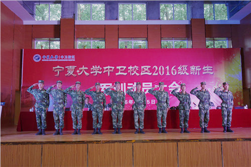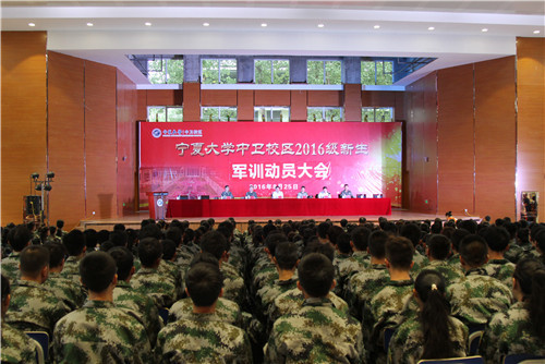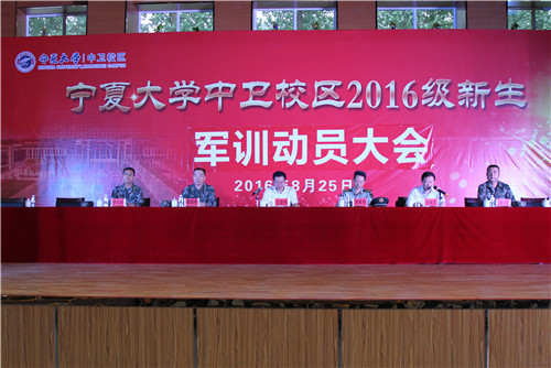 【宁夏大学新闻中心讯 中卫校区】8月25日,中卫校区举行2016级新生军训动员大会。校党委副书记王宏伟、宁夏军分区中卫军分区参谋长邹军利、校国防教育中心主任魏国孝、中卫校区负责人杨振东、国防教育中心副主任方非出席大会。中卫校区全体489名新生参加动员大会。中卫校区副书记李文华主持大会。