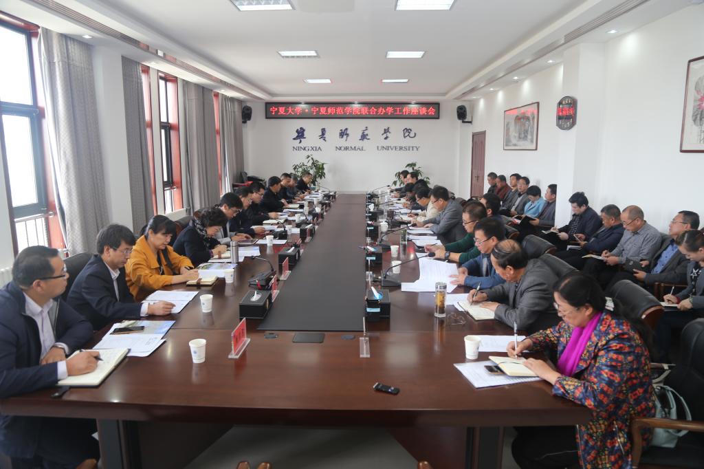 【宁夏大学新闻中心讯 陈建丽/文 马建军/图】10月19日,宁夏大学与宁夏师范学院联合办学2016年第二次联席会在宁夏师范学院召开。校领导金能明、何建国、王宏伟、马宗保,宁夏师范学院领导李星、李静、李龙锦、吴孝、梅军出席了会议。