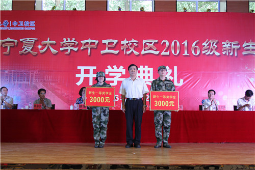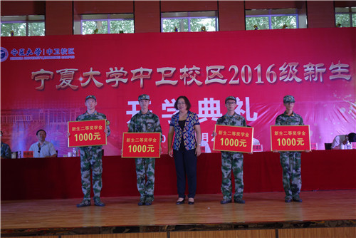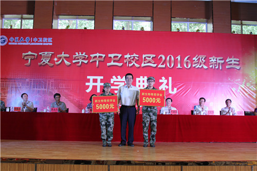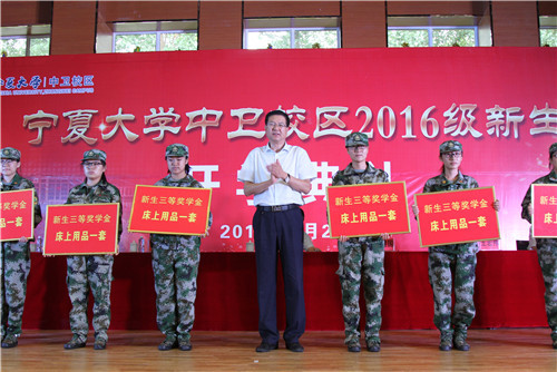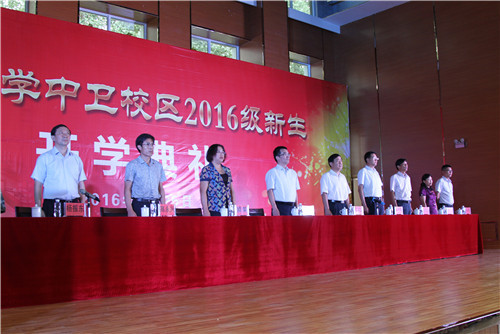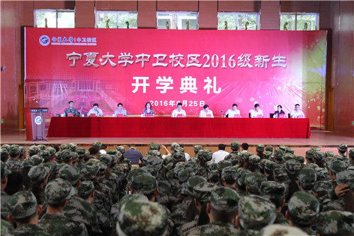 【宁夏大学新闻中心讯 中卫校区】8月25日上午,中卫校区2016级新生开学典礼在中卫校区报告厅隆重举行。我校党委书记金能明、校长何建国、党委副书记王宏伟、学校党办、校办、教务处、人文学院、经管学院、信息工程学院、资环学院、农学院等负责人参加典礼。中卫市副市长蔡菊、中卫市教育局局长王自强应邀出席典礼。中卫校区全体教职工及2016级新生参加开学典礼。杨振东主持开学典礼。