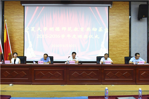【宁夏大学新闻中心讯 胡玥/文 龚旭峰/图】6月30日,我校明德师范教育奖励基金2015—2016学年度颁奖仪式在怀远校区英才报告厅举行。校党委副书记王宏伟和获奖师生代表参加了会议。学生处副处长刘伯川主持颁奖仪式。